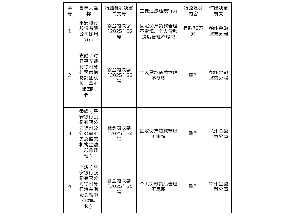 罚单显示,平安银行股份有限公司徐州分行的主要违法违规事实(案由)为:固定资产贷款管理不审慎、个人贷款贷后管理不尽职。